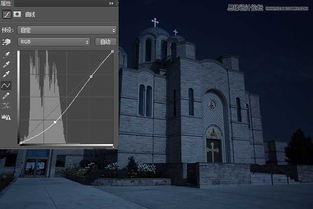 添加一个“曲线”调整层,如图所示设置两个锚点,这将进一步将整个图像转换为黑夜图像,并增加图像的对比度。