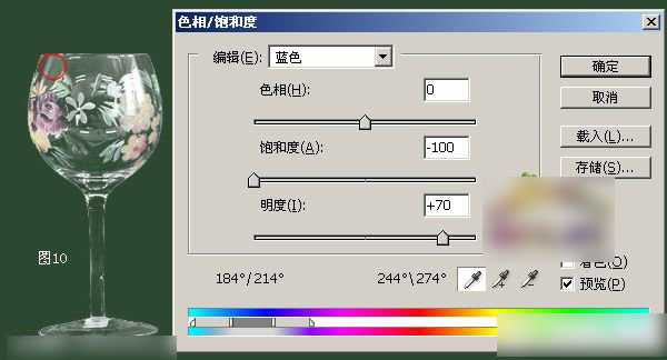 相/饱和度命令,用吸管点一下红圈处,见图10,进一步消除残留的蓝色。