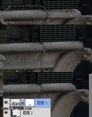 阳台有一些不和谐的抓印,我们要去掉。首先用套索做如下选区,ctrl+J复制选区到新层,挪到右侧覆盖爪印,然后添加蒙版去除多余部分。