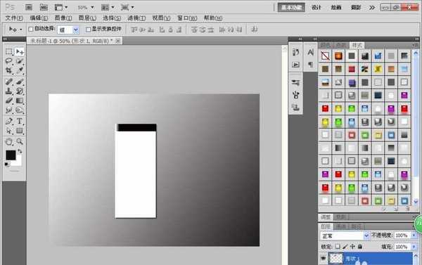 2、选择矩形工具,绘制矩形,填充颜色为白色,选择矩形工具,绘制矩形,鼠标右键栅格化图层,然后对其中的矩形进行渐变颜色的填充,设置颜色从左到右为白色到黑色,点击确定。新建图层,绘制矩形,填充灰色,按住alt键加shift键开始复制移动图层,然后填充颜色,点击确定。双击图层样式,设置白色的矩形,勾选投影的效果,点击确定。然后新建参考线,绘制参考线,如图