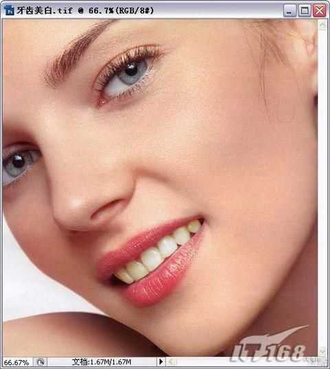STEP1 执行【文件→打开】命令(快捷键Ctrl+O),打开素材图片:“照片.tif”,我们将看到整个图片如图2所示。这里我们不难发现图片中的美女牙齿是“泛黄”的。