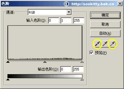 4、再次调节色阶,这次需要利用“选择阴影颜色”和“选择高亮颜色”两个小吸管调整黑白场,左面的吸管吸取的颜色为”黑场“(既:用它选中点的颜色以及比他更深的颜色都变为最深色(黑色)),同理,右面的吸管用来设置”白场“: