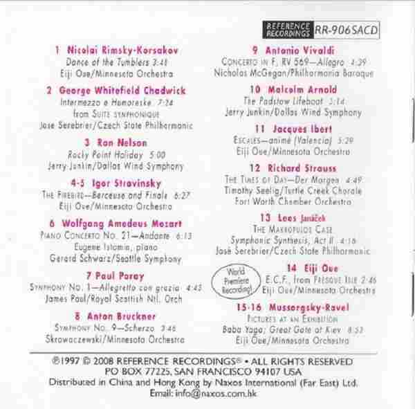 01.Rimsky-Korsakov: Dance of the Tumblers, Eiji Oue/MinnesotaOrchestra02.Chadwick: Intermezzo e Humoreske from Suite symphonique, JoseSerebrier/Czech State Philharmonic03. RonNelson: Rocky Point Holiday, Jerry Junkin/Dallas WindSymphony04-05. IgorStravinsky: The Firebird—Berceuse and Finale, Eiji Oue/MinnesotaOrchestra06. WolfgangAmadeus Mozart: Piano Concerto No. 21—Andante, Eugene Istomin,piano, Gerard Schwarz/Seattle Symphony07. PaulParay: Symphony No. 1 (excerpt), James Paul/Royal ScottishNational. Orchestra08. AntonBruckner: Symphony No. 9—Scherzo, Skrowaczewski/MinnesotaOrchestra09. AntonioVivaldi: Concerto in F, RV 569—Allegro, NicholasMcGegan/Philharmonia Baroque10. MalcolmArnold: The Padstow Lifeboat, Jerry Junkin/Dallas WindSymphony11. JacquesIbert: Escales—animé (Valencia), Eiji Oue/MinnesotaOrchestra12. R.Strauss: The Times of Day—Der Morgen, Timothy Seelig/Turtle CreekChorale, Fort Worth Chamber Orchestra13. LeosJanácek: The Makropulos Case, Symphonic Synthesis, Act II, JoséSerebrier/Czech State Philharmonic14. EijiOue, E.C.F., from Presque Isle, Eiji Oue/Minnesota Orchestra (WorldPremiere)15-16.Mussorgsky-Ravel: Pictures at an Exhibition(excerpts), EijiOue/Minnesota Orchestra.